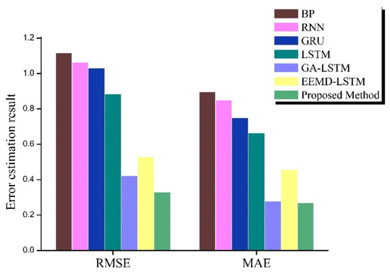 To verify the predictive capacity of the proposed prediction method fairly, we compared it with six comparison methods: the BP, RNN, gated recurrent unit (GRU), LSTM, GA–LSTM, and EEMD–LSTM methods.