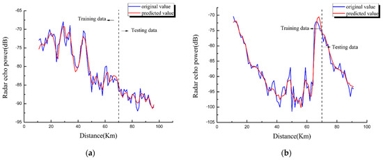 The oceanic duct types that affect radar remote sensing and communication equipment are primarily evaporation and surface ducts. To verify the prediction capability of the proposed EM wave propagation-loss-prediction method for an oceanic duct environment, the simulation hypothesis of this study is as follows: frequency= 10 GHz, Gauss antenna type, beamwidth = 0.4°, elevation = 0.0°, horizontal polarization. The lower boundary of the oceanic duct was set as the impedance boundary with a complex dielectric constant of (70.0,9i). The simulation conditions included Gaussian white noise. The sampling range of the experimental dataset was between 3 and 200 km from the signal transmitting end, with a sampling interval of 100 m and a total of 1970 propagation-loss data. The dataset of propagation loss in an oceanic evaporation duct environment was denoted as sequence 1, and that of a surface duct environment was denoted as sequence 2. In each propagation loss series, the first 1576 path loss values (accounting for 80% of the total data set) were used to construct and train the LSTM prediction layer of the proposed prediction method, and the remaining 394 path loss values (accounting for 20% of the total data) were used to test the prediction performance of the prediction method.