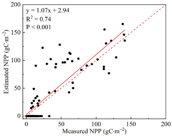 We compared the monthly NPP estimated by the CASA model with the monthly NPP observed at the flux sites in the FLUXNET2015 database (https://fluxnet.org/data/fluxnet2015-dataset accessed on 1 March 2021). The flux site observed gross primary production (GPP), so this value needed to be multiplied by 0.55 (the ratio of NPP/GPP) to convert it into NPP [47]. For all sites (Table 2), the NPP measured at the site and estimated by the model through cross-validation had a regression coefficient of 0.74 and root mean square error (RMSE) of 25.65 gC·m−2 (Figure 2), which indicated a high precision of the CASA model estimation.
