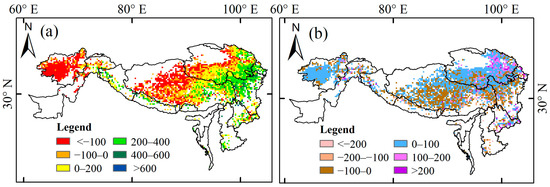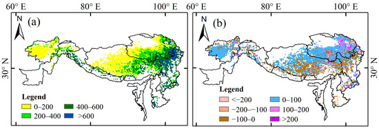 The spatial pattern of (a) averaged grassland NPP during 2001–2018 and (b) NPP difference between 2018 and 2001.