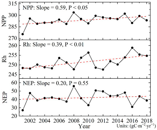 Simulated trends in NPP, heterotrophic respiration (Rh), and NEP in HKH grassland ecosystems from 2001 to 2018.