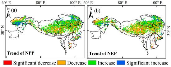 The Mann–Kendall significance test was chosen to analyze the slope change trend of NEP and NPP, and significance level α = 0.05 (|z| ≥ 1.96) was selected to test the significance. There were obvious differences between NPP (Figure 6a) and NEP (Figure 6b), and the area of increase in NPP was more than that of NEP. The area that showed an increased trend in NPP (63.7%) was greater than that in NEP (53.4%). The area where NPP exhibited a significant increase accounted for approximately 13.1% of the total grassland area, and the area where NEP showed a significant increase accounted for about 8.6% of the total grassland area. The areas with significant increases of NPP and NEP were mainly concentrated in the south of the Afghanistan’s Hindu Kush Mountain and the northeast of the Qinghai–Tibet Plateau. The region where NEP showed a downward trend accounted for approximately 46.7% of the total grassland area and was mainly mapped to the southwest of the Qinghai–Tibet Plateau.