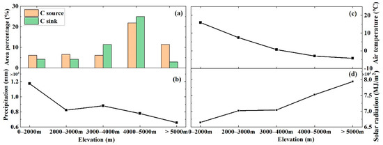 Different elevation classifications of (a) C source or C sink area, (b) mean precipitation, (c) mean air temperature, and (d) mean solar radiation.