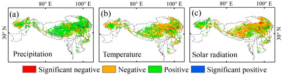 To explore the main influencing factors that cause interannual changes of NPP in different regions, we calculated the partial correlation coefficients between NPP and precipitation, air temperature, and solar radiation (Figure 7a–c). Precipitation was the main limiting factor for NPP (Figure 7a). The area of steppe with NPP that was positively correlated with the precipitation was approximately 1.22 × 106 km2, which accounted for about 67.3% of the total grassland area. The areas with a significant positive correlation between NPP and precipitation were mainly distributed in the Hindu Kush Mountains and the western areas of the Qinghai–Tibet Plateau. The partial correlation between NPP and temperature (Figure 7b) and solar radiation (Figure 7c) was insignificant over most of the area. The total areas of nonsignificant correlation were 1.68 × 106 and 1.7 × 106 km2, accounting for 92.1% and 93.5% of the total grassland area, respectively. The distribution of partial correlation showed that there was no strong correlation between NPP and temperature and solar radiation in most areas of the study area, which indicate that temperature and solar radiation are not the limiting climatic factors that affect the NPP of the HKH grassland ecosystem.