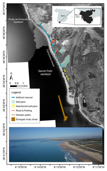 - Benavente, J.; Martínez-del-Pozo, J.A.; Gracia, F.J.; Reyes, J.L.; Del Río, L. Procesos de desbordamiento en la flecha litoral de Sancti-Petri (Bahía de Cádiz): Riesgos asociados. In Estudios Recientes en Geomorfología; Serrano, E., García de Celis, A., Eds.; Universidad de Valladolid: Valladolid, Spain, 2002; pp. 23–32. [Google Scholar]