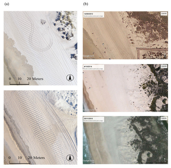 The average elevation at which they appeared was slightly superior to 3 m (above the hydrographic zero), which corresponds to the average range of spring tides in Cádiz. As can be seen in the Google Earth images as well as in the DEMs (Figure 2), these features were always located inland of the berm, an area of the beach that would only be affected by swash during spring tidal conditions.