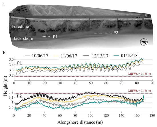 (a) Locations of the alongshore profiles P1 and P2; (b) temporal evolution of the rhythmic features from October 2017 to January 2018 in both profiles. Note the mean high water spring level (MHWS) of 3.185 m in the dashed red line.