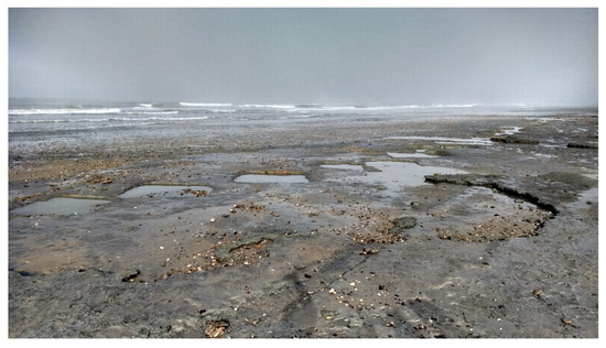 The alongshore profiles extracted from the DEMs revealed that the features did not migrate or move laterally during the topographic surveys (October 2017–January 2018), since the crests and/or runnels maintained exactly their initial positions within the topographic surface (see P1 and P2 in Figure 3a,b). On the other hand, these elongated features evolved simultaneously with the vertical shifts of the topography in the backshore, which in turn progressed responding to the varying hydrodynamic conditions of that period (described below). Thus, the features located at the southern sector (P2 in Figure 3a) became deformed as the backshore progressively flattened, although in the penultimate survey (January 2018), they were still visible (see P2 in Figure 3b). On the contrary, the ones situated in the northern sector (P1 in Figure 3a) maintained their shape more or less (see P1 in Figure 3b). This contrasting temporal behavior between P1 and P2 can be explained by the slightly different elevations of the backshore between both areas. The elevation of the area where P2 was extracted is lower than the area where P1 was built, and thus, it was more exposed to the hydrodynamic forcing and experienced stronger erosion from October 2017 to January 2018. Afterwards, a severe storm made landfall in March 2018, and the parallel features completely disappeared due to average vertical erosion of the foreshore of approximately 1 m [47]. The erosion was such that it caused the exposure of an extensive patch of impermeable peat along the foreshore (Figure 4) [47].