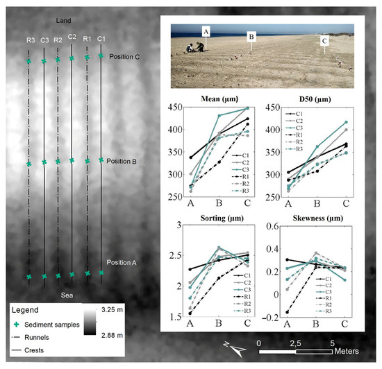 Mean and D50 statistical parameters revealed that the sediment along crests and runnels (positions A, B, and C in Figure 5) was medium sand (250–500 µm), although the runnels (dashed lines in Figure 5) presented slightly smaller grain sizes than the crests (solid lines in Figure 5), as occurs in beach cusps. In addition, grain size increased in the landward direction along both crests and runnels. On the other hand, the sorting parameter exhibited poorly classified sediment in all the samples (2–4 µm) without distinction along crests. However, the samples were moderately sorted and moderately well sorted (1.62–2 and 1.41–1.62 µm, respectively) in the seaward ends of the runnels (A position). With regard to the spatial distribution of the skewness parameter, it showed coarse (or positive) skewness of the sediment along crests C1, C2 C3, and runnel R3; although, in the seaward position (A), the sediment size distributions in runnels R2 and R3 were symmetrical and fine (or negatively) skewed, respectively (Figure 5).