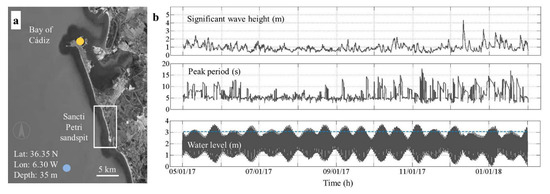 (a) Location of the tidal station (yellow dot) and the SIMAR point 6,012,036 (blue dot); (b) oceanographic conditions from May 2017 to January 2018 (the dashed blue line in the water level time series represents the berm elevation measured in October 2017).