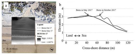 (a) DEM from October 2017 in the area close to P1, displaying the berm from May 2017 (solid line) and October 2017 (dashed line); (b) cross-shore profiles of the study site (close to P1) displaying the berms in May 2017 (solid line) and October 2017 (dashed line).
