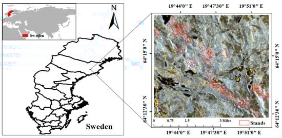 A total of 31 stands were investigated whose size varied between 2.4 and 26.3 ha. The trees which had a DBH (diameter at breast height) greater than 4 cm were measured and recorded. A number of 15 sample trees were randomly selected (selected with a probability proportional to their basal area) per stand on average to measure their height and age. These stands are dominated by evergreen coniferous forest including Scots pine and Norway spruce. The fuel load is calculated based on the allometric equations and field survey for different tree species []. More details about the field data can be found in []. Two stands were found located near bare land, which would bring errors to the analysis. Therefore, we excluded these two stands, and finally kept 29 forest stands, shown as the red border polygon in Figure 1.