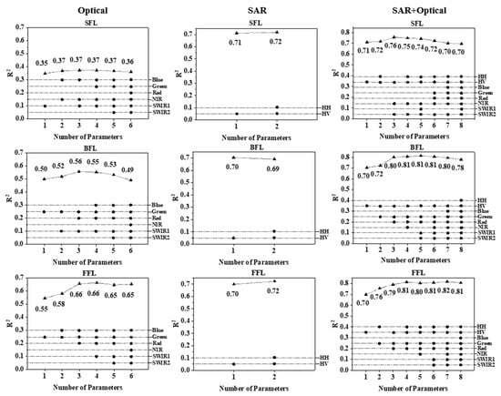 For SFL, the estimation effect of all optical bands is not good; the average R2 is 0.36, among which SWIR1, NIR and Blue bands are the variables with the highest frequency, while SAR has a good performance on SFL, and the prediction accuracy R2 of a single HV polarization reaches 0.71. When combining two kinds of satellite data, as the number of parameters increases, the R2 slightly increases especially when NIR and SWIR2 are added based on HV, but then it begins to decrease. Compared to the individual SAR data (HV), the combination of optical and SAR data has little effect, with the R2 only increased by 0.04. This indicates that optical data cannot provide more information to characterize SFL than SAR data, and the introduction of more optical parameters will bring more errors and uncertainties, resulting in a decrease in model accuracy. Therefore, it is recommended to use only SAR data or introduce a few optical variables to carry out SFL estimation.