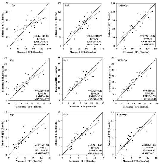 Based on the analyses above, we comprehensively considered the model performance and correlation between variables. A total of nine models including Opt, SAR and SAR + Opt prediction models for SFL, BFL and FFL are selected. Each selected optimal model corresponds to no more than three parameters (i.e., FLs estimated by optical data alone choose the best model composed of three parameters; FLs estimated by SAR data alone choose the model composed of two parameters; FLs estimated by both optic and SAR data choose the best model composed of three parameters), and the corresponding parameters are all contributing the most. The detailed performance of these models is shown in Table 4 and Figure 5.