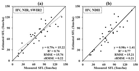 Figure 6 shows the SFL estimation results using the combination of HV and spectral bands, and the combination of HV and the VI, respectively. It can be found that these two experiments achieved similar accuracy (R2 = 0.76, 0.77), which indicates that the VI does not bring significant accuracy improvement.