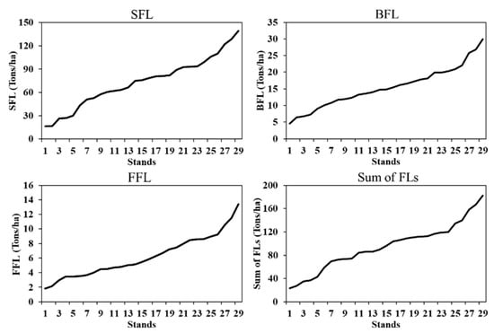 The field sample of this study is the 29 stand scale data. These data are representative although the numbers are relatively small. The datasets have been used and validated for biomass estimation in different studies [,,]. Figure 7. shows the FL value distribution of 29 stands. It can be found that these stands cover a wide range of FL values.