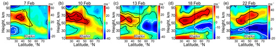 Meridional (latitude–height) cross sections of zonal mean zonal wind on (a–e) 7, 10, 13, 18 and 22 February 2018 from Aura microwave limb sounder (MLS) data. Dashed line shows zero wind. Solid black and white contours outline westerly and easterly zonal flows, respectively, at several characteristic velocities. Vertical line indicated the Kharkiv latitude 50° N.