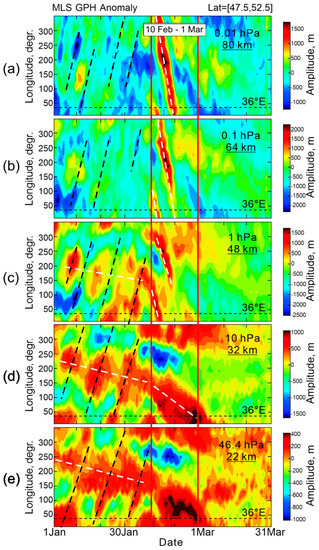 The zonal flow transformation was visible from the time–longitude variations in the MLS geopotential height (Z) anomalies determined with respect to the mean climatology of 2005–2017 for the Kharkiv zone 47.5–52.5° N (Figure 2). The mesospheric and stratospheric levels during January–March 2018 (Figure 2a–e) are presented. Eastward migrating high Z anomalies were observed in the prewarming period (black dashed lines in Figure 2) indicating the traveling planetary wave presence under conditions of westerly zonal wind (Figure 1a,b).