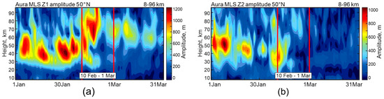 Time–altitude section of (a) wave 1 and (b) wave 2 amplitude in geopotential height at 50° N in January–March 2018 from the MLS data. Vertical lines mark the SSW event between 10 February and 1 March.
