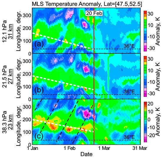 As expected from Figure 2 and Figure 3, the wave spectrum should change with the zonal wind reversal. In the lower–middle stratosphere geopotential height change in the anomaly migration direction (Figure 2d,e) was not as pronounced as at the upper levels (Figure 2a–c). The MLS temperature analysis in Figure 4 confirms that zonal anomalies in the stratosphere existed mainly in the prewarming period January to mid-February 2018 (red vertical line at 20 February). In this period, the westerly zonal wind (Figure 1a,b) was favorable for propagation of wave 1 and wave 2 into the stratosphere–lower mesosphere (Figure 3). The slowly westward migrating positive anomaly in the eastern longitudes was a wave-1 ridge of the quasi-stationary planetary wave (white dashed line in Figure 4a–c), which dominated in the lower stratosphere (23 km, Figure 4c).