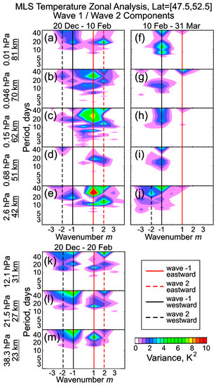 The spectral analysis of the zonal temperature anomalies in the upper stratosphere–mesosphere (a–e) before and (f–j) after the SSW start on 10 February 2018 and in the lower–middle stratosphere at the pressure levels shown in Figure 4 (k–m) during 20 December 2017–20 February 2018. Red and black lines indicate the eastward and westward propagating wave numbers m = 1 (solid lines) and m = 2 (dashed lines). Only variances that are statistically significant at the 95% confidence limit are presented.