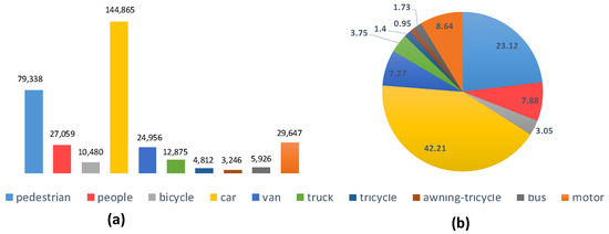The visdrone2018 dataset of (a) the number of objects and (b) the proportion of various classes.
