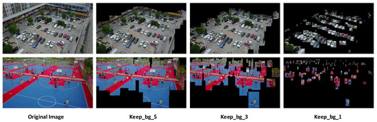 The image slices are used in image pyramid methods such as SNIP [11], SNIPER [12], and AutoFocus [13], which cause the destruction of object detection context. However, feature pyramid networks in this paper use the whole image to train, thus avoiding the same problem. In this section, to study the influences of background context on object detection, we conducted a simple comparative experiment. Based on a RetinaNet trained on the original image, part of the background in the test images was then removed to study the object detection model’s performance changes. Some experimental pictures are shown in Figure 8.