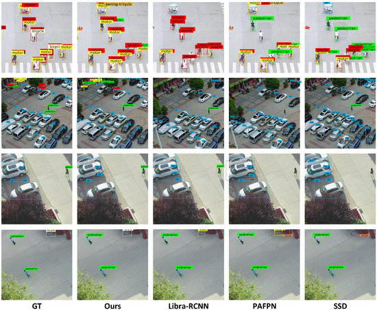The experiments are performed on the Visdrone2018 [10] dataset, which has 8599 images (6471 for training, 548 for validation, and 1580 for testing), containing more than 340,000 labeled objects, with a total of 10 classes, including pedestrian, person, car, van, bus, truck, motor, bicycle, awning-tricycle, and tricycle. Some of the images and their annotations are shown in Figure 6. The angle, scale and illumination changes, and dense small objects in this dataset make high-precision object detection very challenging.