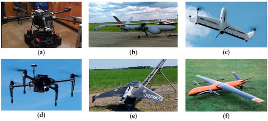 UAVs’ types that are used in precision agriculture; (a) six rotary-winged, (b) large fixed-winged, (c) VTOL (Vertical Take-Off and Landing), (d) four rotary-winged, (e) mini fixed-winged, and (f) large VTOL.