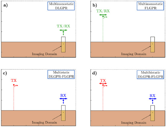 In order to introduce and compare the proposed hybrid FLGPR-DLGPR architecture [19], the most common GPR architectures (described in Section 1) and the proposed one are depicted in Figure 1. Figure 1a corresponds to a DLGPR system where the GPR antennas are oriented towards the ground with normal incidence. Figure 1b shows an FLGPR architecture, being the GPR antennas several meters away from the imaging domain and oriented at grazing incidence. The proposed hybrid FLGPR-DLGPR architecture is depicted in Figure 1c,d, where the transmitter antenna (at grazing incidence) is placed at several meters from the receiver (pointing normal to the ground). Figure 1c corresponds to the case where the transmitter is static and the receiver moves over the scanning area, whereas the transmitter moves synchronously with the receiver in Figure 1d.