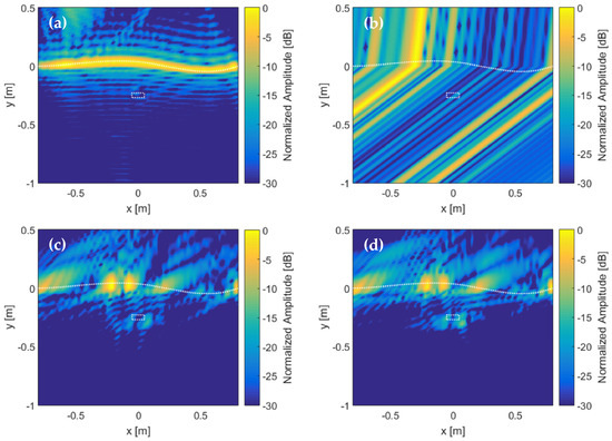 Synthetic Aperture Radar (SAR) image from Finite-Difference Frequency-Domain (FDFD) simulations with a flat-top dielectric target buried under a rough surface (dashed line indicates the soil surface) extracted from [19]: conventional DLGPR (a) and FLGPR (b) configuration; proposed hybrid FLGPR-DLGPR architectures in which the transmitter is static (c) and the transmitter moves synchronously with the receiver (d).