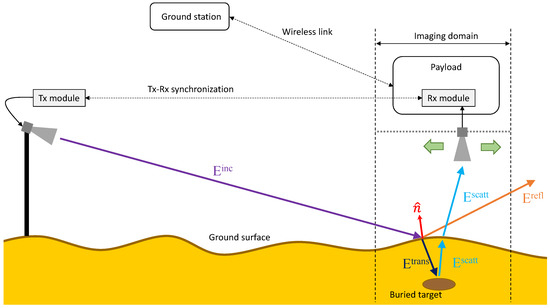 A scheme of the hybrid FLGPR-DLGPR architecture to be implemented and validated is shown in Figure 3. The transmitter will be kept static whereas the receiver will be moved over the scenario under test (that is, the GPR imaging domain). Transmitter and receiver modules must be synchronized to enable the coherent processing of the measurements, not only in range, but also in cross-range (i.e., along the axes orthogonal to the vertical range axis). Assuming ideal conditions, the transmitting antenna will be pointed towards the center of the imaging domain. Part of the incident field (Einc) will be reflected (Erefl) in the ground surface, but little or none reflected field will be captured by the receiving antenna, as the specular reflections from the ground surface will not reach it. Another part of the incident field will be transmitted into the ground (Etrans) and, in case of a buried target is present, it will be scattered back to the ground surface (Escatt). Finally, a portion of this scattered field might eventually reach the receiving antenna.