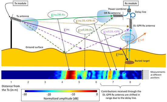 Thanks to the use of the delay line, contributions received through the DL-GPR Rx antenna can be better distinguished from contributions received through the DR Rx antenna, just by means of spatial filtering.