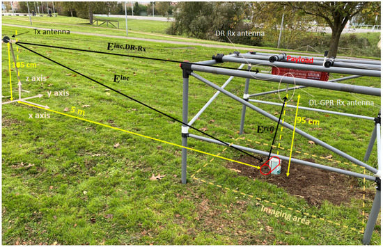 The plastic box shown in Figure 6 is mounted onto a sliding arm that can be manually displaced along a distance of approximately 150 cm in the x-axis, as described in [20]. The sliding arm can also be moved the same distance in the y-axis. A linear sweep is performed by displacing the plastic box along the sliding arm on top of the frame of the setup. After performing a round-trip sweep along the x-axis, the sliding arm is manually moved along the y-axis to another position. Due to the size of the plastic box, the dimensions of the scanning area are restricted to 100 cm × 100 cm, approximately. The DL-GPR RX antenna is around 85 cm above-ground.