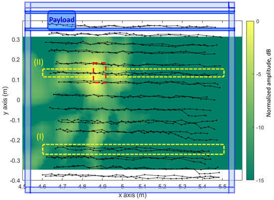 As observed in Figure 7 and Figure 9, the imaging domain has been limited from y = −0.35 m to y = 0.32 m due to the fact that in this first validation test, sweeps along the y-axis were spaced 5 cm on average, which is greater than λ/2 at the highest working frequency (5 GHz) so aliasing appeared when considering x-axis sweeps outside the range from y = −0.35 m to y = 0.32 m. Concerning sweeps along the x-axis, samples were taken every 3.2 cm on average.