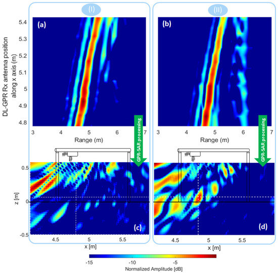 Next, reflectivity images from each of the selected individual sweeps, denoted as (I) and (II), are retrieved applying GPR-SAR processing. It should be noted that in this case, as only single sweeps are considered, a two-dimensional (2D) GPR-SAR processing is conducted in the vertical plane parallel to the movement direction during each sweep, i.e., an XZ plane. In addition, although during each sweep along the x-axis radar acquisitions were limited to , the imaging domain was extended to to analyze if potential contributions due to air–ground reflections appear in the GPR-SAR image. Results for the sweeps (I) and (II) are plotted in Figure 8c,d, respectively.