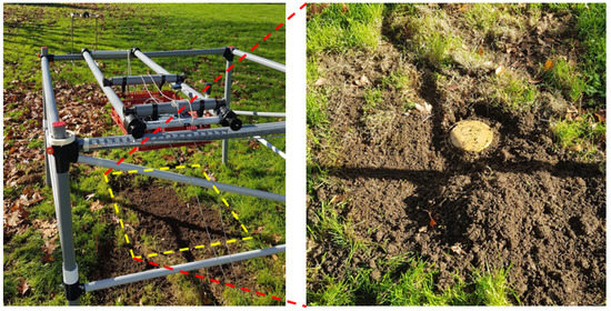 Next, the hybrid FLGPR-DLGPR system to detect shallow targets was tested. For this purpose, a model of non-metallic (plastic) anti-tank landmine was buried at 2–3 cm depth, as shown in Figure 10, resembling a realistic scenario. In this case, sweeps along the y-axis were spaced 3 cm to avoid aliasing. Only GNSS-RTK positioning information provided with the highest accuracy (fix operation mode) was considered, thus resulting in an acquisition domain ranging from y = −0.35 m to y = +0.18 m (RTK was not in fix operation mode for x-axis sweeps beyond y > +0.18 m due to the poor satellite coverage in the field where the experiments were performed).