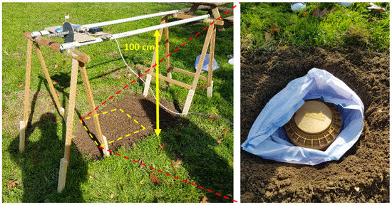 For verification purposes, a second measurement of the plastic landmine buried at 2–3 cm depth has been conducted. This measurement consisted of a single linear sweep along the x-axis performed by manually displacing the receiving devices in 2-cm steps from x = 5 m to x = 6.30 m. The measurement setup is depicted in Figure 12: instead of using the portable setup [20], a simpler supporting structure was implemented to simplify the manual displacement of the platform containing the receiving devices. In this case, 2D GPR-SAR imaging is conducted (XZ plane, y = 0 cm).