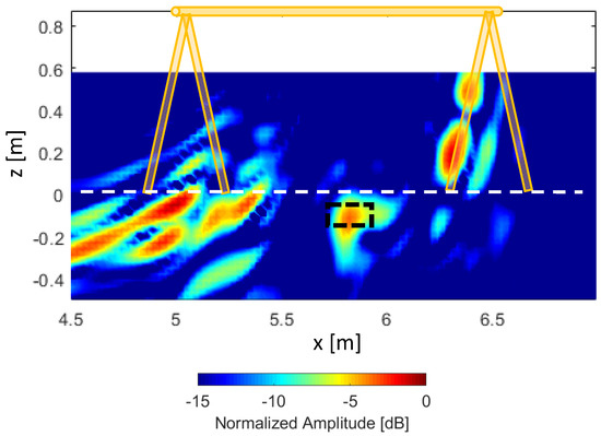 Imaging results are plotted in Figure 13, where the reflectivity peak corresponding to the buried landmine can be identified at about x = 5.7 m. As in the previous examples shown in this contribution, air–ground reflections are negligible. Inside the imaging domain, a high level of clutter can be noticed only around x = 5 m and x = 5.2 m (which might be due to reflections in the supporting wooden structure). Furthermore, the reflection happening in the rear wooden supporting structure can be noticed in Figure 13.