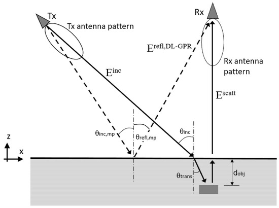 To complement the qualitative validation of the detection capabilities of the hybrid FLGPR-DLGPR system, a quantitative analysis based on a simplified propagation model is presented next. This quantitative analysis provides an estimation of the signal-to-clutter ratio at the receiver. In particular, the power reflected on the buried target (solid arrows, Figure 14) will be considered as the signal, and the power reflected on the ground due to specular reflection (dashed arrows, Figure 14) as the clutter. For the sake of simplicity, it will be considered that the main contribution of the field backscattered on the buried target will be normal to the soil–air interface, as depicted in Figure 14. The analysis has been performed considering both TE (Transverse Electric) and TM (Transverse Magnetic) polarizations.