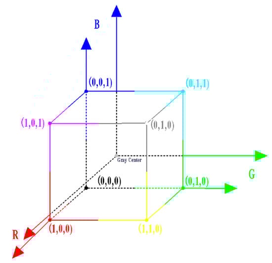 In this paper, we work in gray-centered RGB color space (i.e., the origin of the RGB color space is placed at the center of the color cube). For 24-bit color images, the translation is achieved by simply subtracting (127.5, 127.5, 127.5) from each pixel value in RGB space. By so doing, all pixels along the same direction from mid-gray have the same hue [29]. This translation operation effectively moves all the pixels on the apple image by half the distance from their own pixels in the RGB color space, forming a new coordinate system with medium gray as the origin. The conversion of this space coordinate system is shown in Figure 1.