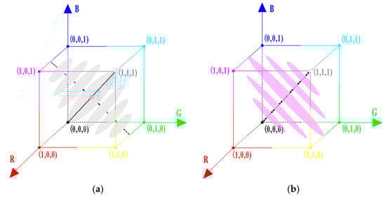 Using the quaternion algebra and the COI characteristic, vector decompositions of an image that are parallel and perpendicular to the “grayscale” direction (1, 1, 1) are obtained. The work is carried out in the gray-centered RGB color space in which the origin of the RGB color space is shifted to the center of the color cube. The image is first switched from the original RGB color space to gray-centered RGB color space. Thus, all the pixels along the same direction from the mid-gray have a similar hue. Subsequently, the algebraic operations of the quaternion are used to complete the vector decomposition of the image. Finally, all pixels are shifted back to the origin of RGB color space. The decomposition diagram is shown in Figure 2.