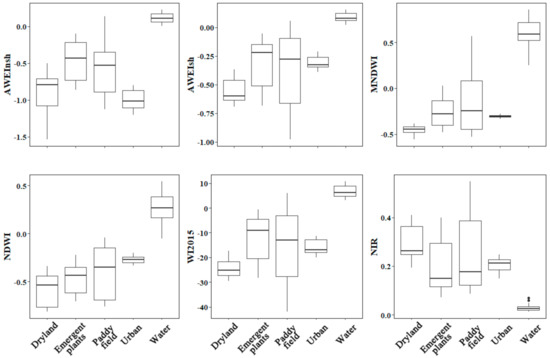 Box plots of six indices for different landcover types based on the chosen sample points are shown in Figure 2. All of the indices can distinguish open water surfaces from dryland, emergent plants, and urban. However, the ranges of water and paddy field overlap to some extent, except for the NIR band reflectance index. From the boxplots, the minimum values of NDWI, MNDWI, AWEInsh, AWEIsh, and WI2015 and the maximum NIR band reflectance value for the sampled water area were applied as the thresholds to distinguish open water surface pixels from nonwater pixels to the seven images representing different water levels and seasons.