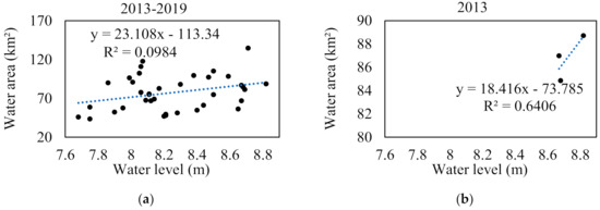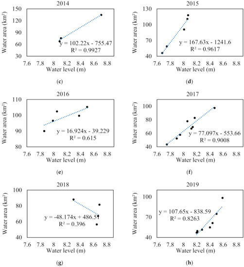 Figure 3a shows the correlation of the open water surface extracted from all of the Landsat 8 images from 2013–2019 and corresponding in situ observed water levels. A scattered and weakly positive relationship is observed. When the data are grouped by year, the positive correlation becomes considerably stronger in most years (Figure 3b–h). The R2 is higher than 0.6 for all years except 2018, for which the number of satellite observations is very limited due to cloud cover. The slope of the best-fit linear relation varies from year to year. These features indicate large interannual variations in the relationship between open water surface area and water level.