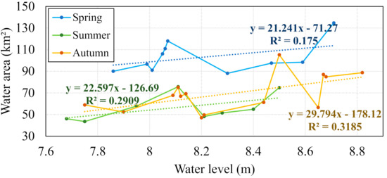 The relationship between open water area and water level is also assessed in different seasons. Figure 4 shows that the positive correlations for spring, summer, and autumn are all higher than the correlation for all of the data (Figure 3a). This indicates that the pattern and magnitude of open water area variation with water level differ between spring, summer, and autumn. In all three seasons, the open water area generally increases with increasing water level, but the increase is not linear for all seasons and a certain degree of fluctuation is observed. The water area is highest when the water level reaches the upper limit of its range, whereas peaks of open water areas are also found when the water level is between 8.0 and 8.2 m. This implies, that the topographic features are unique in this elevation range, compared with other ranges, and further examination is required. For a given water level in most of the elevation ranges, the open water area is considerably higher in spring than in summer and autumn, the latter of which show a similar relationship between open water area and water level. This indicates that a certain type of landcover occupies a portion of the open water area in the spring season.