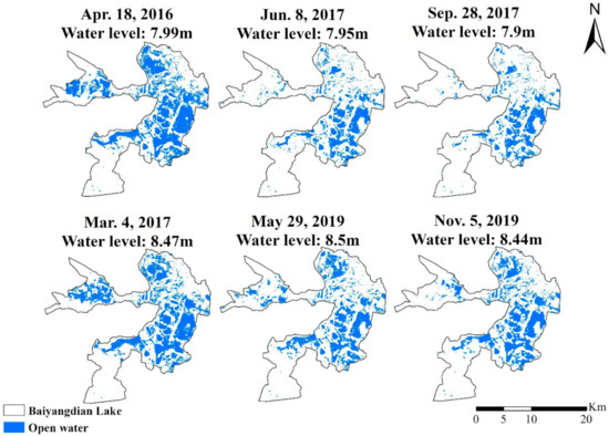 The region has a semihumid continental monsoon climate with a mean annual precipitation and evaporation of 563.9 and 1369 mm, respectively. More than half of the water area grows a variety of seasonal aquatic vegetation including emergent plants such as Phragmites australis, which cover the water area beneath [47]. In this study, the water body area observed by satellite images refers to the uncovered water surface and is hereafter called the open water area.