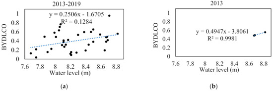 (a) Scatter plot of water level and BYDLCO index from 2013 to 2019; (b–h) scatter plots of water level and BYDLCO index during each year.