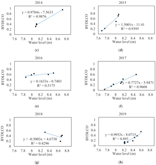 The relationship between the hydrological connectivity composite index, BYDLCO, and water level for the entire period and each of the individual years is shown in Figure 6. Similar to the open water surface area, the relationship for the entire period shows a high level dispersion, whereas strong positive correlations are detected for each individual year, except 2018. The slope of the best-fit line varies from 0.1633 in 2015 to 1.5001 in 2014, which indicates that the relationship between BYDLCO and water level exhibits high interannual variability.