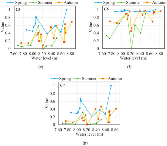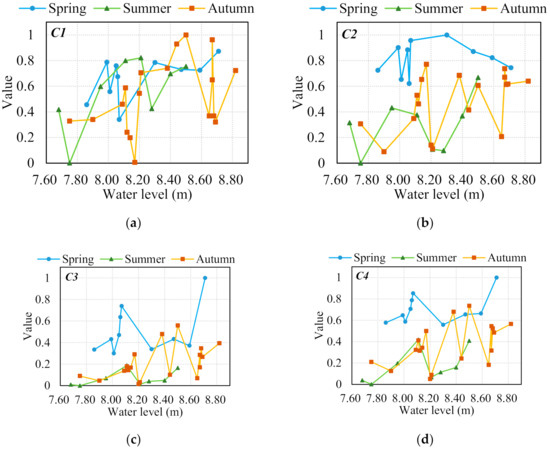 The seasonal relationships between water level and each of the seven indexes composing BYDLCO were also analyzed (Figure 8). The index values are generally highest in the spring for a given water level that is the same, followed by the autumn value, except for C1 (Figure 8a). In most cases, each index value increases with increasing water level with different degrees of fluctuations. Interestingly, the fluctuation is highest for most indexes when the water level is in the range of 8.0–8.2 m, followed by a rapid rise and decent with further increasing water level.