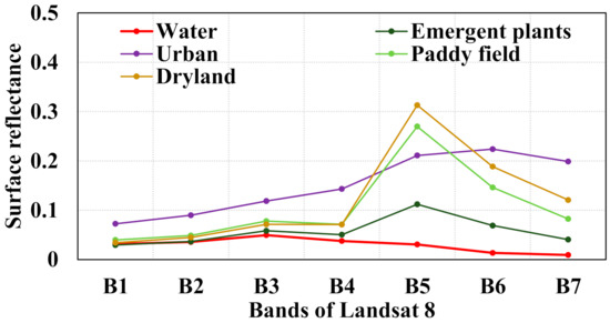 The water indexes combine reflectance values from different wavelengths and are formulated to maximize the reflectance differences between water and nonwater areas for classification. Our study shows that the accuracy of the water area classification is higher when using the NIR band reflectance index, and the variance is lower than the other five indexes using information from multiple bands. The index that performs second best, NDWI, also intensively uses NIR band reflectance. This can be explained by the fact that the reflectance differences between land cover types considered in this study are highest in the NIR band (Figure 9). For medium spatial resolution like Landsat 8, Fisher et al. [53] found that no single index performed better in all of the evaluated water bodies and depended on the composition of the land and water types. Huang et al. [16] also indicated that differences in sediments and other optical active constituents within the water can influence the applicability of certain water indexes to certain water bodies. Zhang et al. [68] compared the accuracy of commonly used water indexes in an open water body at five sites in North America, Australia, North Africa, and East Asia with different climates and found that NDWI, AWEInsh, and AWEIsh have limitations when extracting turbid water. From three sites in the Yangtze River Basin, Yellow River Basin, and Haihe River Basin in China, Jiang et al. [23] concluded that AWEInsh and MNDWI are more vulnerable to shadow pixels. Our results show that for Landsat 8 images, the reflectance of the NIR band is the most effective water index in BYDL, which has a moderate level of eutrophication [69,70]. Han and Cui [71] found that water transparency has high spatial heterogeneity in BYDL that must be considered to better classify open water areas in future studies. Indeed, the reflectance characteristics of inland surface water bodies are complex and highly influenced by local conditions. A full evaluation of the commonly used water index methods, such as that performed here, is therefore necessary to determine the best index for a particular water body.